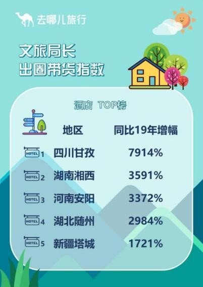 据“去哪儿”平台不完全统计,平台上2月20日至3月6日,“文旅局长酒店预订带货”指数最高的目的地为:四川甘孜、湖南湘西、河南安阳、湖北随州、新疆塔城,其中四川甘孜、湖南湘西、河南安阳近两周酒店产品预订量同比2019年同期增幅超30倍,其中湘西酒店下单预订增幅高达3591%。