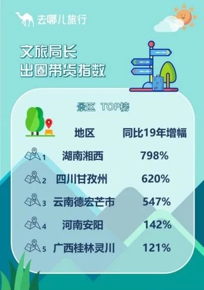 景区方面,“去哪儿”平台上“文旅局长景区门票带货”指数最高的目的地排名为:湖南湘西、四川甘孜州、云南德宏芒市、河南安阳、广西桂林灵川,其中湖南湘西、四川甘孜州、云南德宏芒市近两周景区产品预订量同比2019年同期增幅超5倍,湖南湘西增幅最高,达798%,近8倍。