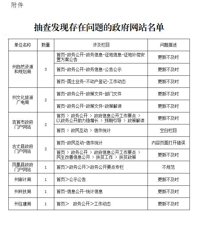 (一)信息更新不及时。抽查中发现少数网站信息更新不及时。其中:州自然资源和规划局3个,州文化旅游广电局2个,吉首市政府、古丈县政府、州审计局、州科技局、州住建局各有1个栏目更新不及时。