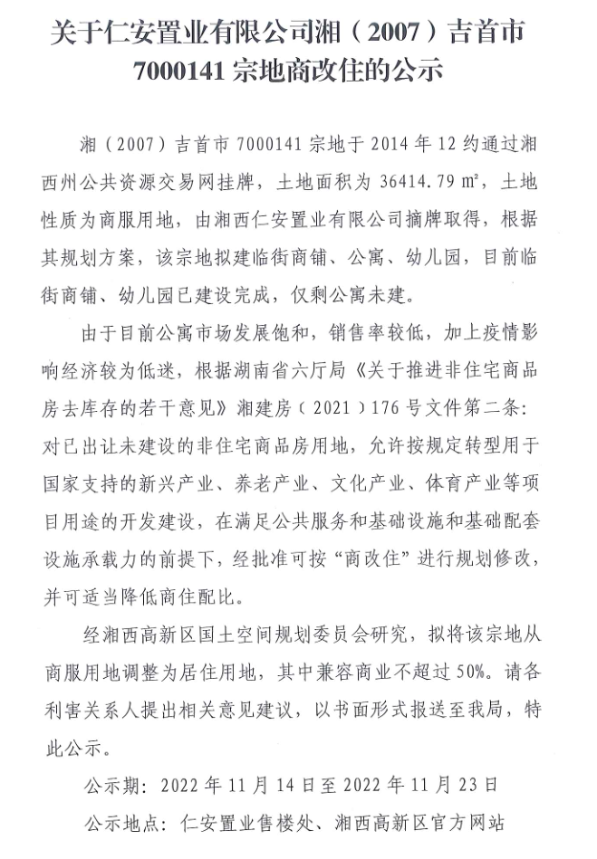 关于仁安置业有限公司湘(2007)吉首市7000141宗地商改住的公示