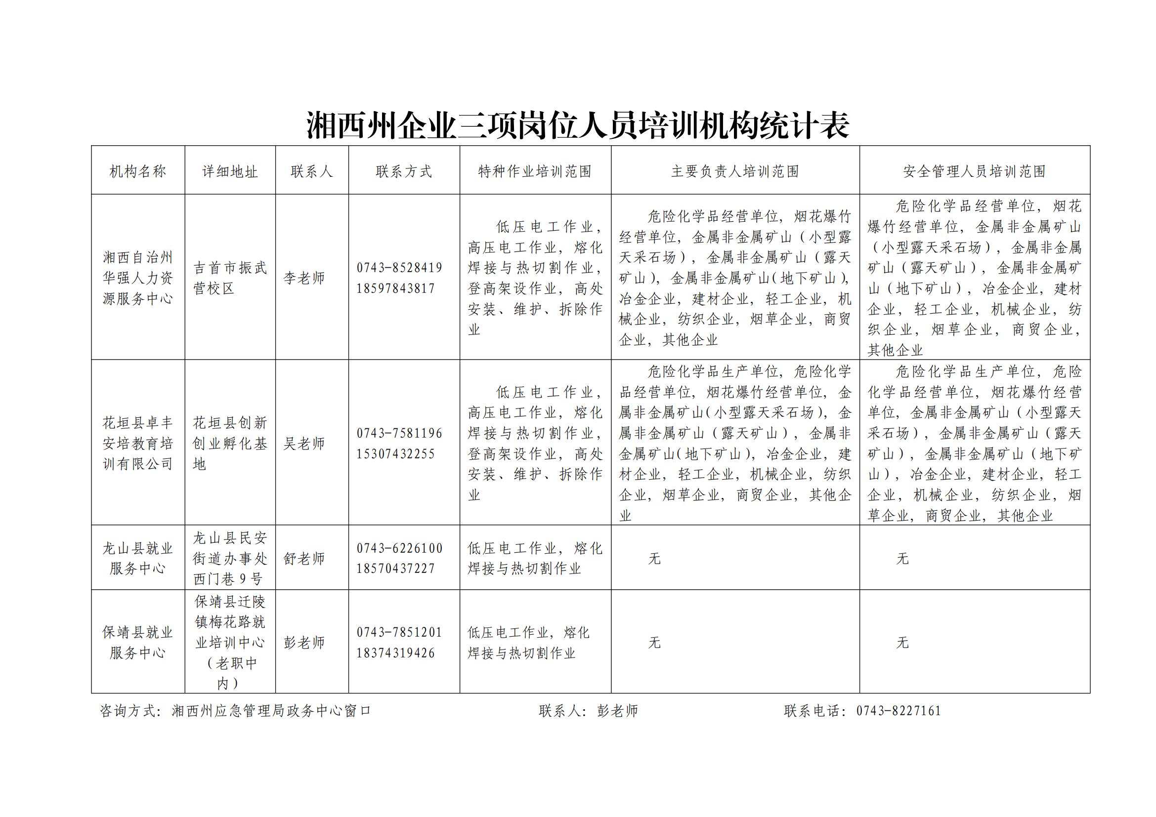 湘西州企业三项岗位人员培训机构统计表