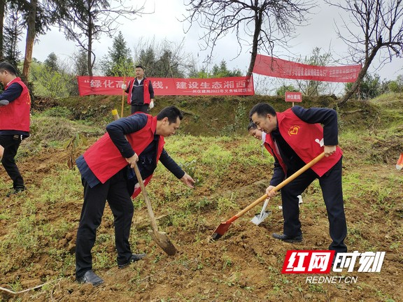 红网时刻湘西3月18日讯(记者 张鋆 通讯员 宋雪)为绿化高铁沿线,推进生态湘西建设,3月18日,湘西州住建局(州人防办)和吉首市住建局组织开展“绿化高铁沿线,建设生态湘西”义务植树活动。州住建局党组书记、局长(主任)李云信带队前往吉首东站,用实际行动为高铁沿线添绿加彩。