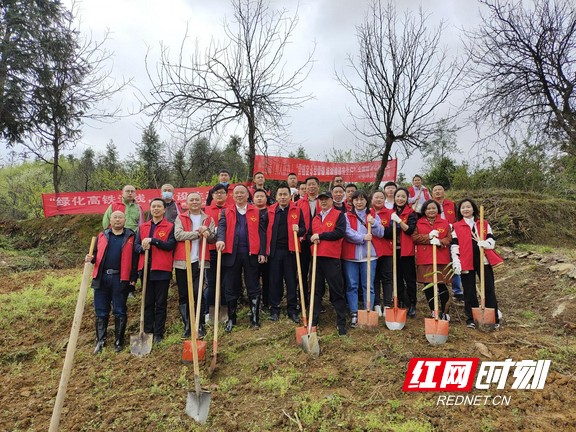 植树现场,众人热情高涨、干劲十足。一行人提着树苗,拿着铲子,便爬上了山坡开始种植树苗。一人将树苗扶稳,另两个人负责填土,三五人分工合作,和谐效率,到处洋溢着团结协作、昂扬向上的浓厚氛围。不一会,这一片小山坡都被种满了绿色的小树苗,昨天刚下过雨的土壤松软湿润,小树苗稳稳扎根在湿润的土壤里,在明媚的春光中呈现出勃勃生机。油菜花点缀着青山,桃花也在春风中伸展着枝瓣,高铁从山脚下驶过,在大家的挥汗奋战和默契配合下,圆满完成了此次植树任务。